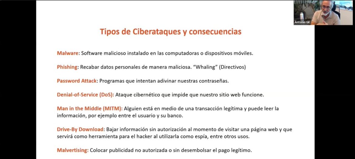 Antonio también explicó los diversos tipos de amenazas cibernéticas, desde malware y phishing hasta ataques de ransomware, detallando las posibles consecuencias, incluyendo pérdidas financieras y daños a la reputación. Además, se exploraron los aspectos legales relacionados con la protección de datos, con un enfoque en el cumplimiento de normativas como el GDPR.
