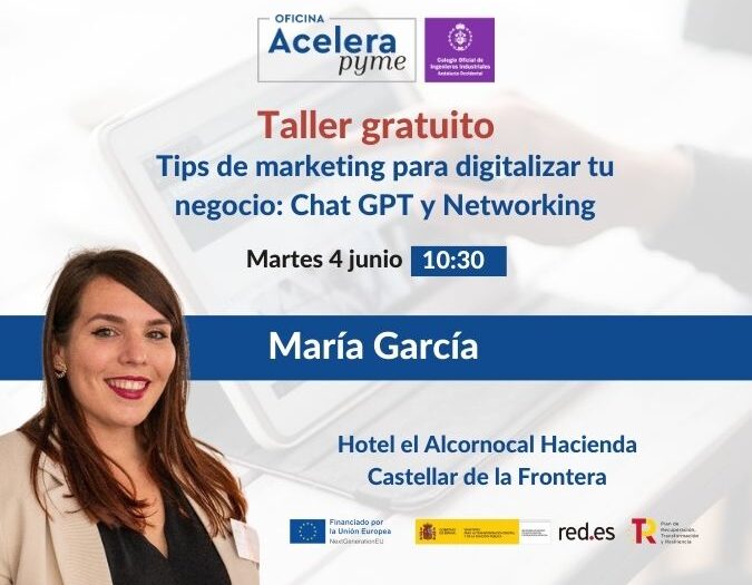 En Acelera Pyme estamos encantados de invitarte a nuestro próximo taller gratuito titulado “Tips de Marketing para Digitalizar tu Negocio: Chat GPT y Networking”. Este evento se llevará a cabo el martes 4 de junio a las 10:30 de la mañana en el Hotel el Alcornocal Hacienda, ubicado en Castellar de la Frontera.