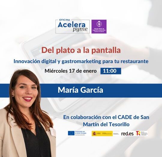 ¡Descubre nuevas formas de llevar tu restaurante al siguiente nivel! En Acelera Pyme Coiiaoc, queremos invitarte a nuestro próximo evento: «Del plato a la pantalla: innovación digital y gastro marketing para tu restaurante». Este evento, en colaboración con el CADE de San Martín del Tesorillo, contará con la destacada ponente María García, de Comunicación Al Dente.