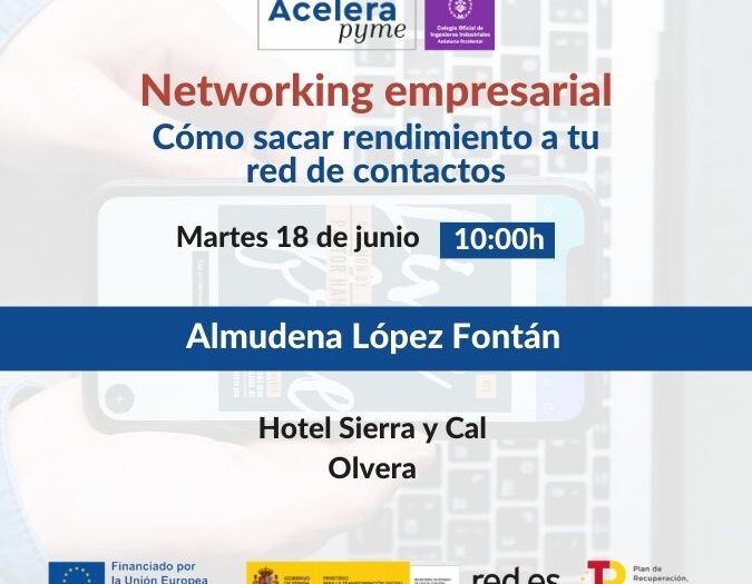 ¡Te invitamos a nuestro próximo evento titulado “Networking empresarial: Cómo sacar rendimiento a tu red de contactos”! Este taller, dirigido por la reconocida experta Almudena López Fontán, se llevará a cabo el martes 18 de junio a las 10:00 de la mañana en el Hotel Sierra y Cal de Olvera.